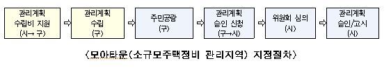 □ 모아타운 대상지로 선정되면 추후 각 자치구가 ‘모아타운 관리계획’을 수립하고 주민공람, 위원회 심의를 거쳐 모아타운으로서 법률적 효력을 갖는 ‘소규모주택정비 관리지역’으로 승인․고시되는 절차를 통해 모아주택 사업이 본격 추진된다.