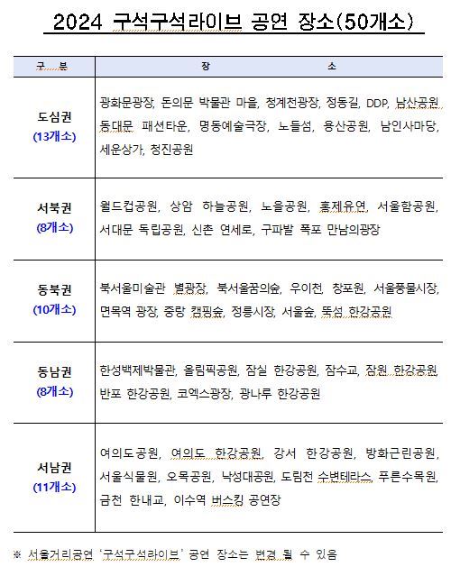 □ 시는 시민 누구나 일상 속에서 쉽게 거리공연을 즐길 수 있도록 올해 공연 장소를 ▴도심권(13개소) ▴서북권(8개소) ▴동북권(10개소) ▴동남권(8개소) ▴서남권(11개소) 등 서울 전역으로 고르게 선정했다.