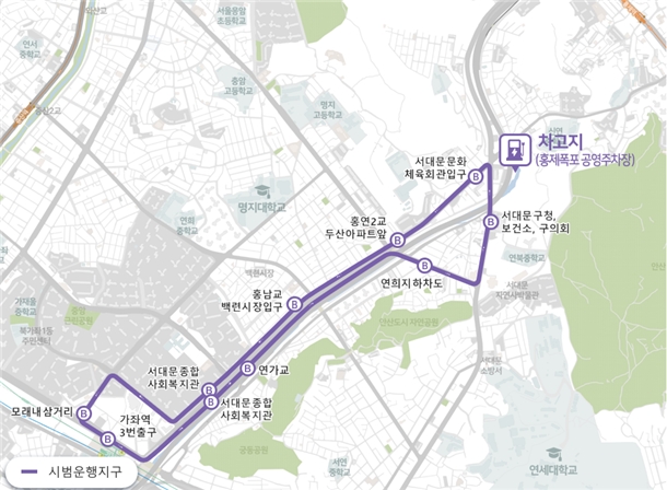 □ 가좌역~서대문구청 구간을 오가는 ‘서대문A01’은 서대문문화체육회관, 서대문종합사회복지관, 서대문구청․보건소, 가좌역 등을 연결해 행정․복지시설 접근성을 높이고 철도 환승 편의를 제공할 예정이다. 10개 정류소(순환 5.9km)를 순회하며, 30분마다 한 대씩(점심시간대 80분) 하루 14회 운행된다.