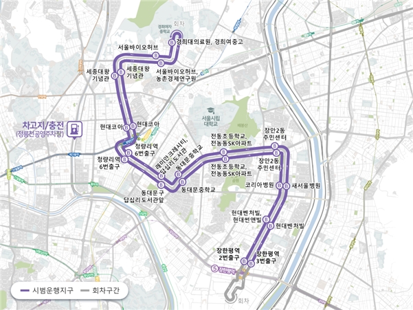 □ ‘동대문A01’은 지역 의료․연구․생활 수요를 균형 있게 담아내기 위해 청량리역, 서울바이오허브, 장안2동주민센터 등을 경유한다. 자율주행버스 2대가 투입돼 23개 정류소(왕복 15km)에 정차하고, 75분마다 한 대씩(점심시간대 135분) 하루 6회 운행된다.