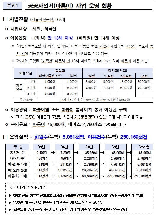 □ 앞서 도입한 ‘가족권’도 인기다. 원래 따릉이는 만 13세 이상만 이용할 수 있는데 부모가 ‘가족권’을 구매하면 13세 미만 자녀도 보호자 감독하에 따릉이를 탈 수 있다.