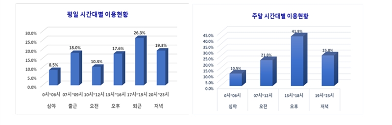 ○ 심야시간대(00시~06시)에도 평일 8.5%, 주말 10.5%의 이용 비중을 보이며 대중교통 제한 시간대에 이동을 뒷받침하는 수단으로서의 역할도 톡톡히 하고 있었다.