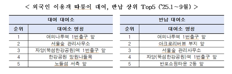 ○ 외국인 이용이 많은 대여·반납장소는 ▴여의나루역(영등포구) ▴서울숲 관리사무소(성동구) ▴뚝섬한강공원 자양역(광진구) 등 도심 대표 여가·관광지였다.