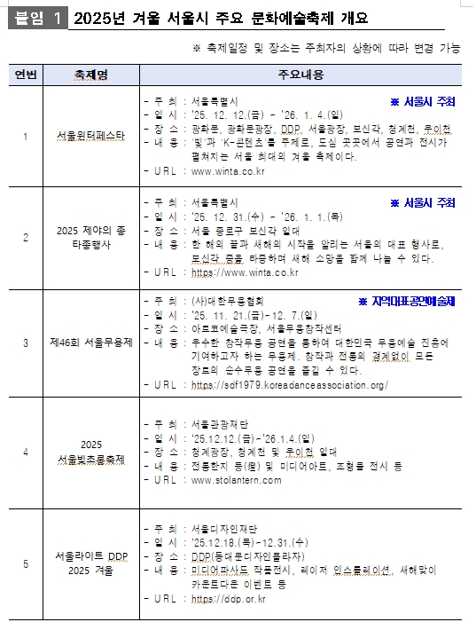 □ 주요 축제로는 ‘빛’과 ‘K-콘텐츠’를 주제로 도심 곳곳에서 공연과 전시가 펼쳐지는 ▴서울윈터페스타(12.12.(금)~‘26.1.4.(일), 광화문, DDP, 청계천 등), 한해의 끝과 새해의 시작을 알리는 ▴2025년 제야의 종 타종행사(12.31.(수)~’26.1.1.(목), 보신각 일대)가 눈길을 끈다. 이외에도 다양한 무용공연을 즐길 수 있는 ▴제46회 서울무용제(11.21.(금)~12.7.(일), 아르코예술극장)와 전통놀이 및 공예체험을 통해 설날을 만끽할 수 있는 ▴2026 서울 운현궁 행운가득 설맞이(가제)(‘26.2.16.(월)~2.18.(수), 서울 운현궁 앞마당)도 열린다.