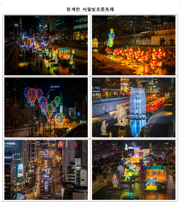 ○ (청계천) ‘서울빛초롱축제’는 도심 속 물길을 따라 빛의 산책로를 즐기려는 시민들로 북새통을 이루고 있다. 형형색색의 등불과 빛 조형물이 겨울밤의 운치를 더하며 가족·연인 단위의 관람객들에게 큰 호응을 얻고 있다.