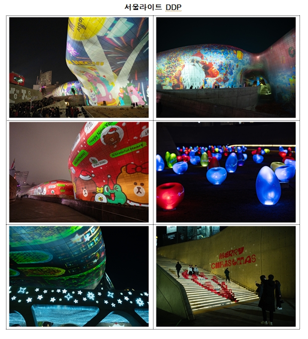 ○ (DDP) ‘서울라이트 DDP’에서는 귀여운 캐릭터와 크리스마스 오브제를 압도적인 미디어아트로 선보이며 관람객들의 시선을 사로잡는다. 특히 어울림광장~팔거리~잔디언덕을 잇는 거대한 크리스마스 타운은 외국인 관광객과 MZ세대의 필수 방문 코스로 자리 잡았다.
