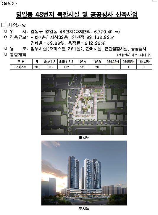 □ 명일동 복합시설은 고덕역(5호선)과 9호선 연장 예정지 인근 교통요충지에 지하 7층·지상 32층 규모 복합시설이 들어선다. 오피스텔 361실과 함께 판매시설, 근린생활시설, 공공청사가 결합된 복합타워로 조성된다.