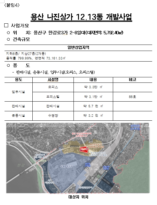 □ 용산 나진상가 12·13동 일대는 ICT·AI 등 신산업 중심 업무시설과 주거·판매 시설이 결합된 전자상가 혁신거점으로 조성된다. 지하 8층~지상 27층 규모로 업무시설 약 3만3천㎡, 오피스텔 88실, 판매시설과 운동시설이 복합배치된다.