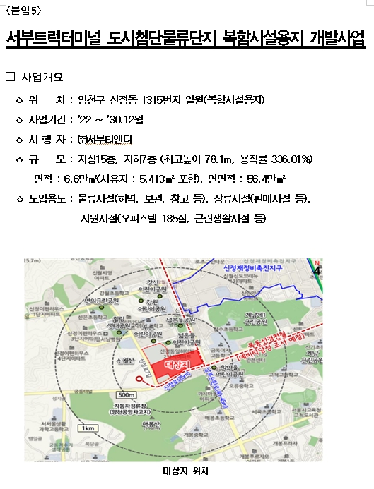 □ 양천구 신정동 서부트럭터미널은 약 56만㎡ 규모의 도시첨단물류단지로 재탄생한다. 지하 7층·지상 15층 규모로 물류시설 약 28만㎡, 판매시설 약 19만㎡, 오피스텔 180여실과 체육·문화시설이 함께 들어선다.