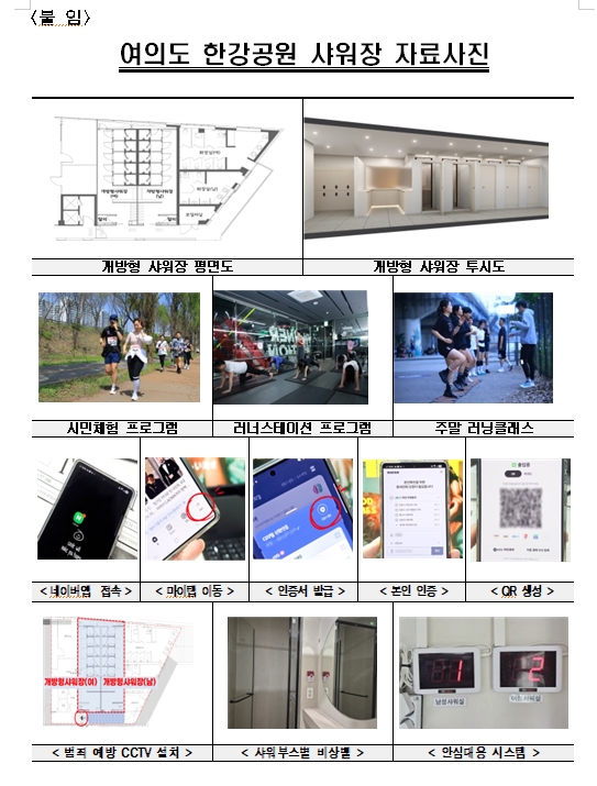 □ 서울시는 여의도한강공원 안내센터 1층에 ‘개방형 샤워장’을 조성하고 운영에 들어간다고 4일(일) 밝혔다. 샤워장은 ‘네이버 QR출입기록 관리’로 스마트폰 QR 인증을 통해 출입 가능하며, 매일 오전 6시 30분~22시 이용(청소 시간 16~17시)할 수 있다.
