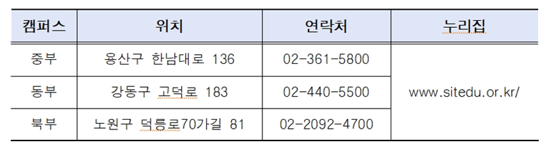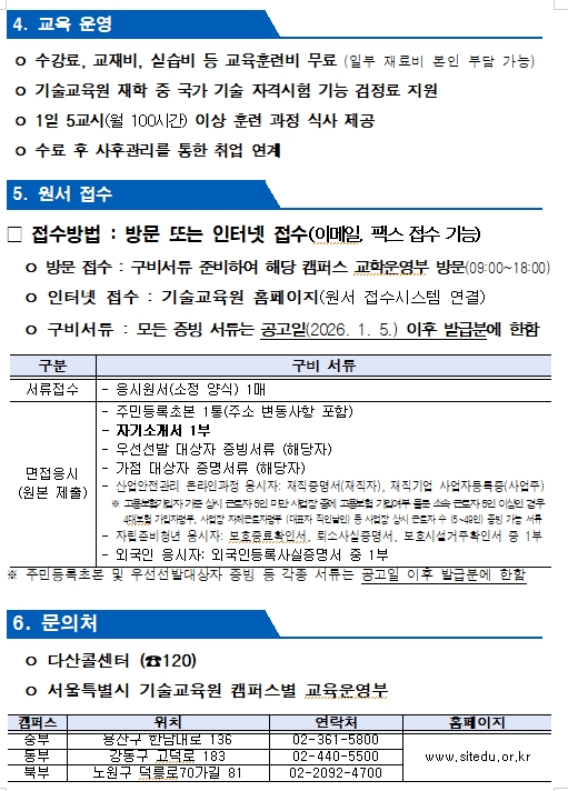 □ 지원자는 구비서류를 갖춰 각 캠퍼스에 직접 방문하거나 기술교육원 누리집(sitedu.or.kr)을 통해 온라인 접수하면 된다. 자세한 모집 내용은 각 캠퍼스 또는 120 다산콜센터에서 확인할 수 있다.
