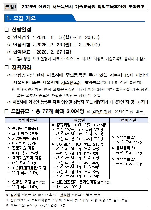 □ 취업을 앞둔 청년과 재취업을 고민하는 중장년 모두에게 ‘대체되지 않는 기술’이 중요한 선택 기준으로 떠오르는 가운데, 서울시는 AI 시대에도 경쟁력을 갖춘 실무 기술인재를 양성하기 위해 2026년 상반기 서울시 기술교육원 훈련생 2,004명을 모집한다고 밝혔다.