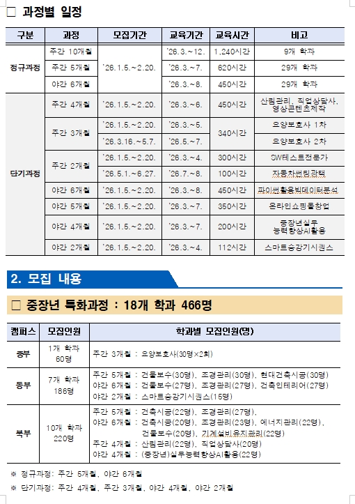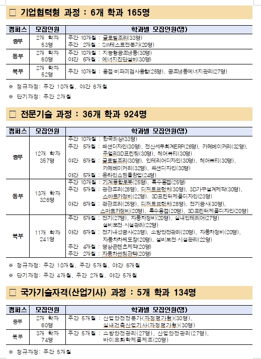 □ 이번 상반기에는 총 77개 학과에서 2,004명을 모집하며, ▴중장년 특화과정 18개 학과 466명 ▴기업협력형 과정 6개 학과 165명 ▴전문기술과정 36개 학과 924명 ▴국가기술자격 과정 5개 학과 134명 ▴AI・하이테크 융합과정 12개 학과 315명이다.