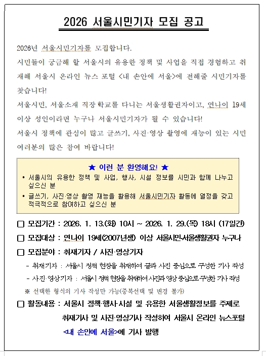 □ 서울시는 시민이 직접 서울의 정책과 일상을 취재하고 전달할 ‘2026 서울시민기자’를 모집한다. 모집기간은 1월 13일(화)부터 29일(목)까지로, 연나이 19세 이상 서울시민·서울생활권자라면 누구나 서울시 온라인 뉴스포털 <내 손안에 서울>에서 신청할 수 있다.