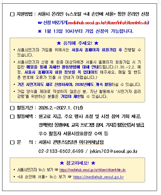 □ 올해 서울시민기자의 활동기간은 ’26년 2월부터 ’27년 1월까지이다. 서울시민기자에게는 서울시 주요 행사 초청, 주요 정책 취재미션 참여, 온라인 교육 프로그램 수강 등의 혜택이 주어진다. 기사가 채택·발행되면 소정의 원고료 및 모바일 기자증이 지급되며, 매달 ‘우수기사상’과 1년 후 ‘우수기자상’ 선정 기회도 주어진다.