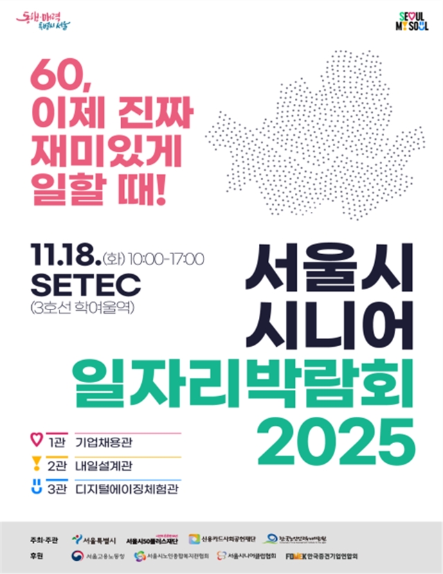 □ 서울시는 오는 11월 18일(화) SETEC(강남구)에서 「서울시 시니어 일자리박람회 2025」를 개최한다. 초고령사회 대응 종합대책 ‘9988 서울 프로젝트’의 하나로 마련된 이번 박람회에서는 시니어들이 쌓아온 경력과 전문성을 살려 경제적 자립을 이루고 사회참여를 확대할 수 있도록 다양한 프로그램이 진행된다.○ 이번