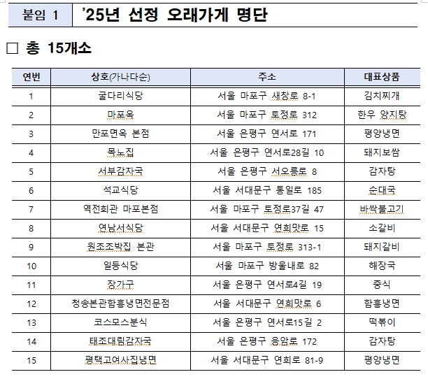 ○ 최종 선정된 오래가게는 ▴마포구 5개소(굴다리식당, 마포옥, 역전회관, 원조조박집, 일등식당), ▴은평구 6개소(만포면옥, 목노집, 서부감자국, 장가구, 코스모스분식, 태조대림감자국), ▴서대문구 4개소(석교식당, 연남서식당, 청송본관함흥냉면, 평택고여사집냉면)이다.