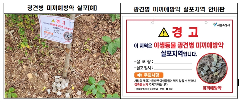 □ 아울러 서울시는 야생동물의 광견병 예방을 위해서 약 4만 개의 ‘야생동물용 광견병 미끼 예방약’을 10월 13일부터 10월 27일까지 서울시 주요 외곽 산·하천지역 및 너구리 출몰 공원 등에 살포한다.