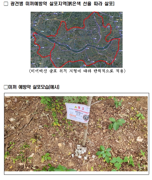 □ 미끼예방약에 사람의 체취가 남으면 야생동물이 섭취하지 않을 수 있어 살포된 곳에는 현수막과 경고문을 부착해서 시민들이 만지지 않도록 안내할 예정이며, 섭취하지 않은 미끼 예방약은 살포 약 30일 후부터 수거된다.