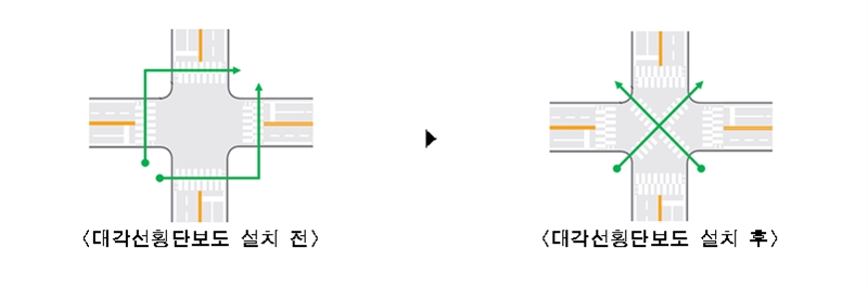 <이달 준공 2곳 포함, 올해 총 5곳 설치… 효과 분석 토대로 대각선횡단보도 지속 확대>