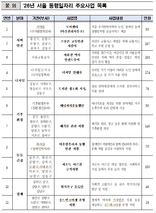□ 서울시가 이처럼 취업 취약계층이 또 다른 사회적 약자를 돕고 자존감을 회복하는 ‘서울 동행일자리’ 사업을 내년에도 확대 운영한다. 시는 내년도 상반기('26.1.9~6.30.) 동행일자리 사업을 통해 총 6,598명이 사회안전·돌봄건강·디지털·기후환경·경제 등 5개 분야의 729개(시·구 합산) 사업 현장에서 활동할 예정이라고 밝혔다.