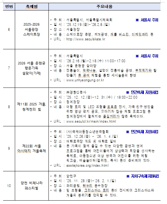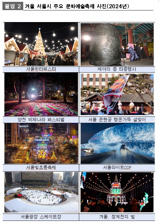 □ 주요 축제로는 ‘빛’과 ‘K-콘텐츠’를 주제로 도심 곳곳에서 공연과 전시가 펼쳐지는 ▴서울윈터페스타(12.12.(금)~‘26.1.4.(일), 광화문, DDP, 청계천 등), 한해의 끝과 새해의 시작을 알리는 ▴2025년 제야의 종 타종행사(12.31.(수)~’26.1.1.(목), 보신각 일대)가 눈길을 끈다. 이외에도 다양한 무용공연을 즐길 수 있는 ▴제46회 서울무용제(11.21.(금)~12.7.(일), 아르코예술극장)와 전통놀이 및 공예체험을 통해 설날을 만끽할 수 있는 ▴2026 서울 운현궁 행운가득 설맞이(가제)(‘26.2.16.(월)~2.18.(수), 서울 운현궁 앞마당)도 열린다.